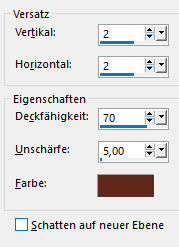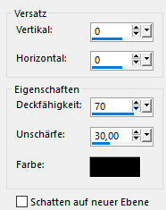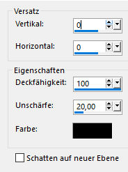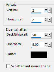 neue Ebene in dein Bild ein. Bild - Größe ändern, auf ca. 65-55 % verkleinern, Haken bei "Größe aller Ebene anpassen" darf nicht gesetzt sein. Gegebenfalls, Bild - Spiegeln - Horizontal spiegeln. Einstellen - Schärfen - Scharfzeichnen Verschiebe sie nun auf die linke Seite, sie Tube sollte nicht in die oberen Rechtecke ragen. Wende nun folgenden Schlagschatten in Schwarz an