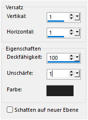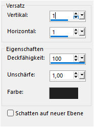 Zoome dir das Bild größer und klicke 2-Mal in die Auswahl mit der VGF. Auswahl aufheben und diesen Schatten anwenden in Schwarz.