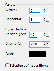 Höhe von 580 Pixel, kopieren und als neue Ebene in dein Bild einfügen. Auf die rechte Seite verschieben. Einstellen - Schärfen - Scharfzeichnen. Wende nun diesen Schatten entweder mit Schwarz oder der Farbe 3 an